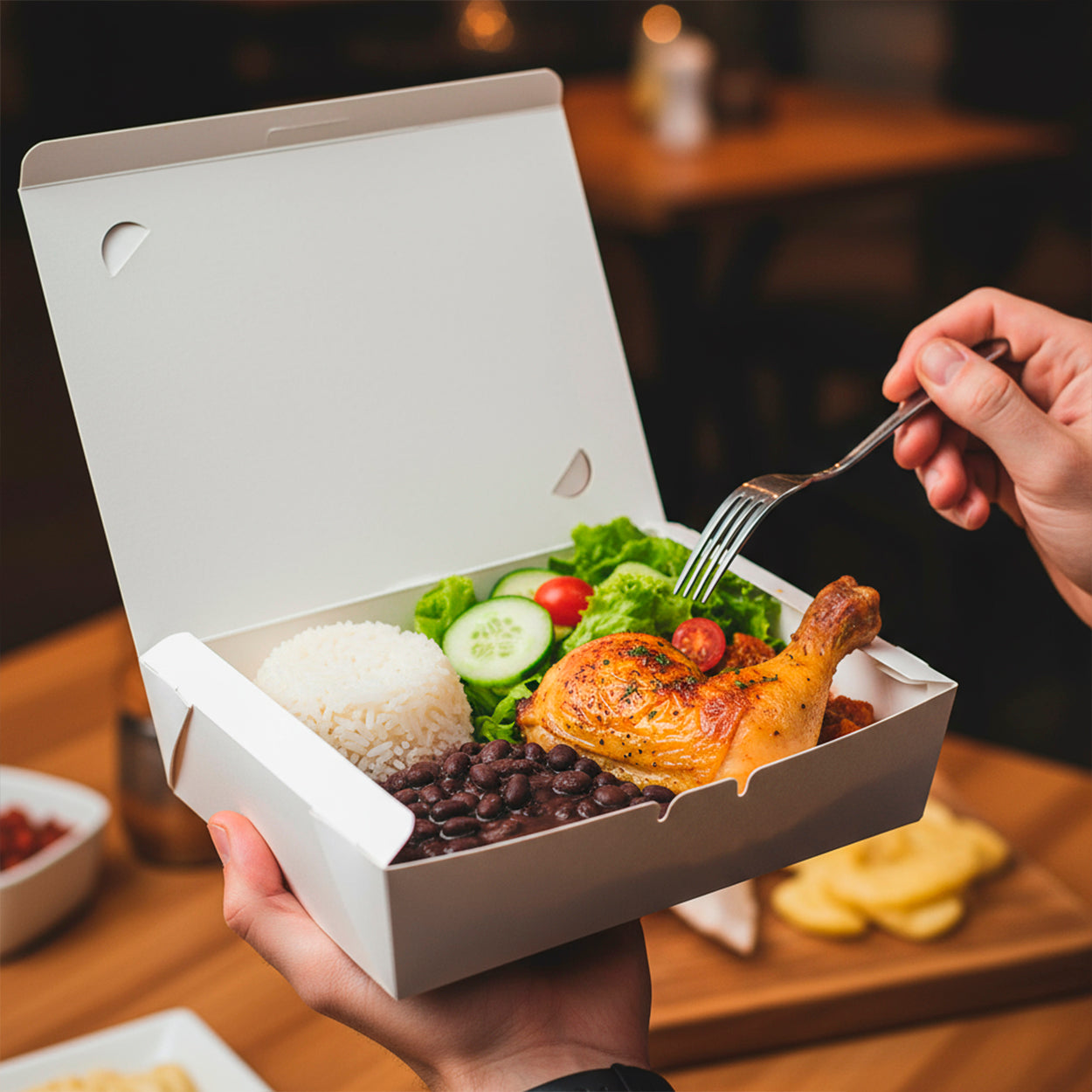 A Box Refeição Automática White 1500ml é ideal para refeições, marmitas, saladas, massas e pratos executivos, unindo praticidade, resistência e apresentação sofisticada. Seu formato colado elimina a necessidade de montagem, proporcionando muito mais agilidade e praticidade no dia a dia, além de facilitar o manuseio no transporte e nas entregas.