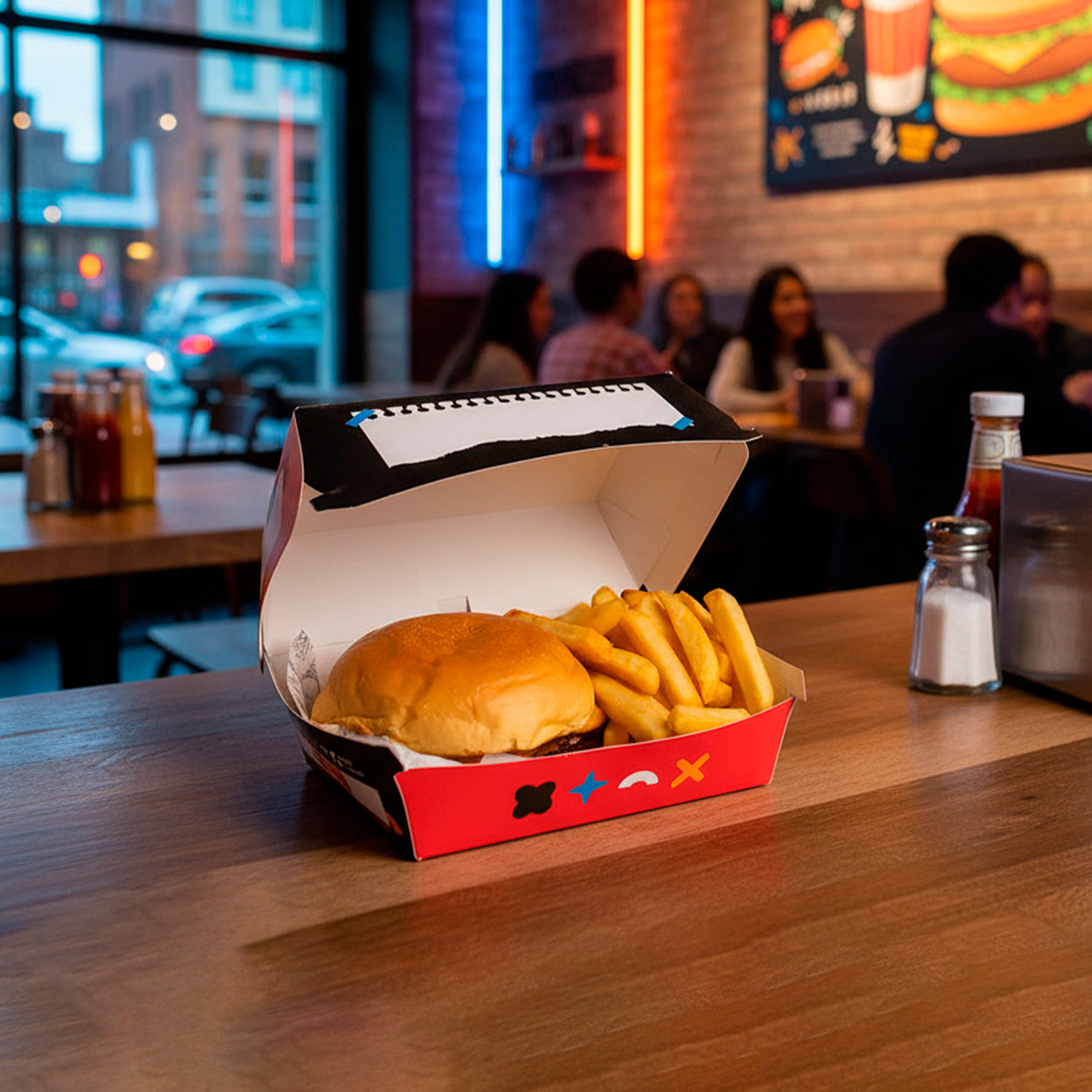 Perfeita para combos de hambúrguer, batata frita, nuggets, onion rings e acompanhamentos, oferecendo praticidade e uma apresentação moderna para delivery ou consumo no local.