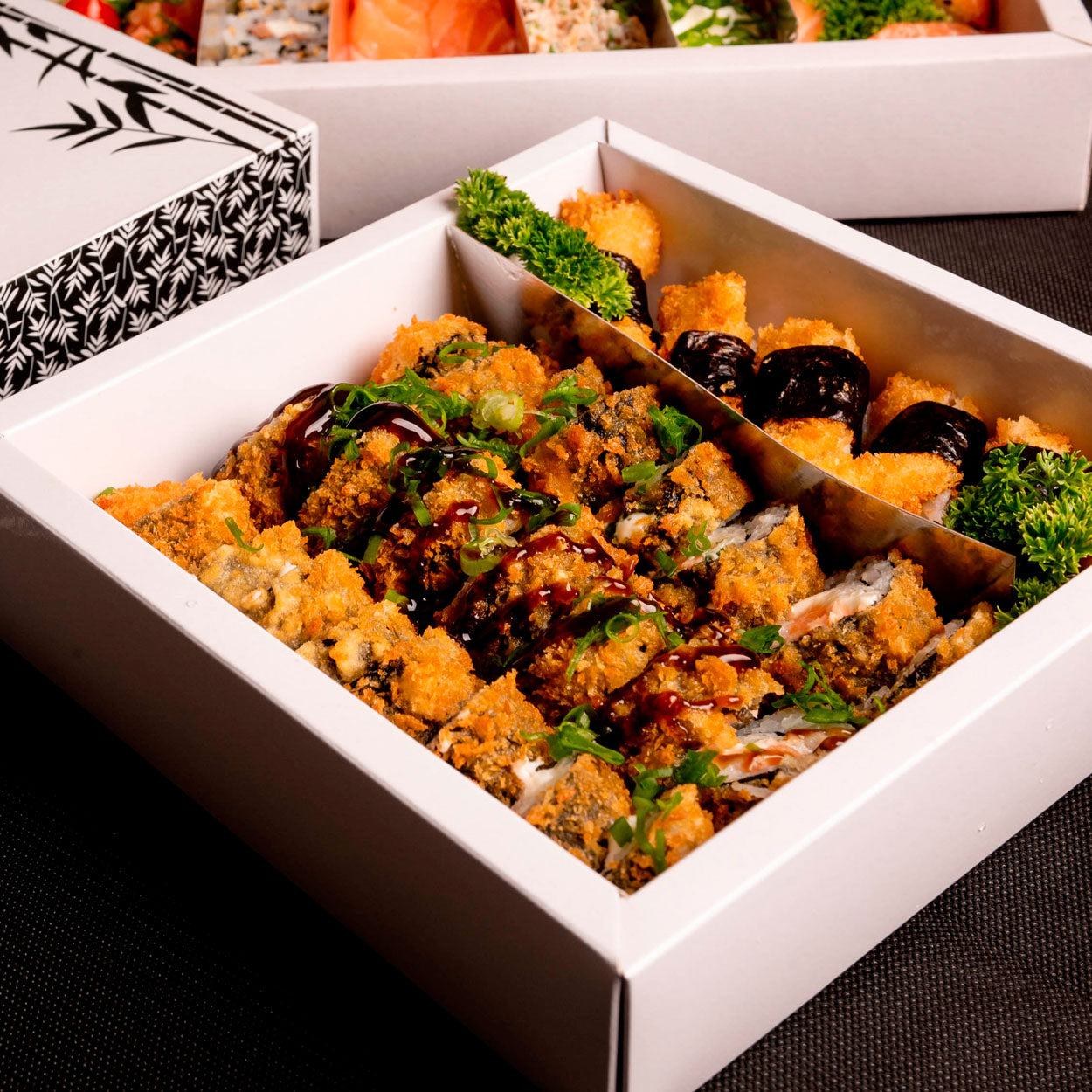 Acompanha paleta divisória, que além de organizar diferentes tipos de sushis, sashimis ou petiscos, permite colocar produtos quentes e frios na mesma embalagem, preservando cada item em seu espaço.