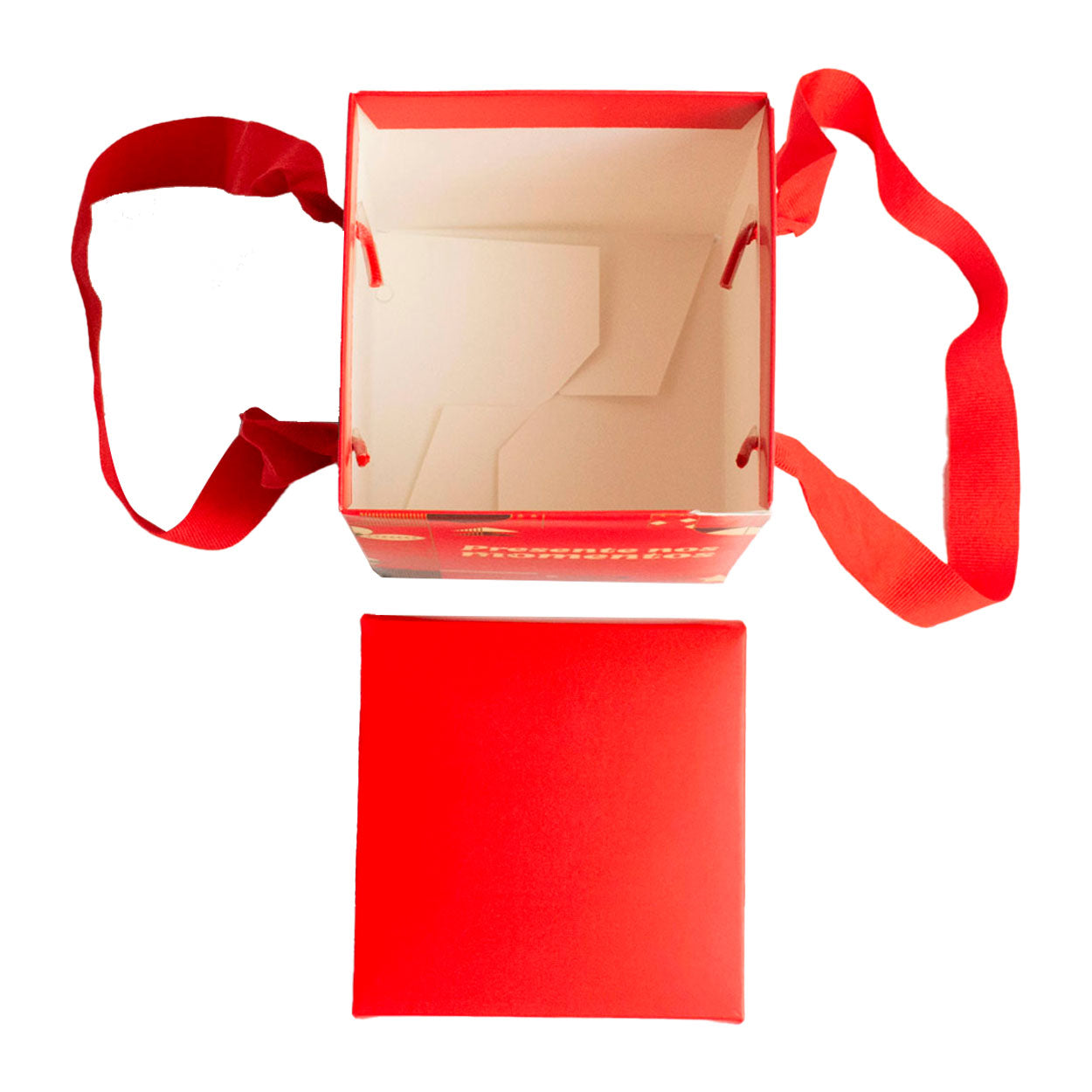 Caixa para panetone ou doces natalinos com base, tampa, ambos com acabamento fosco alça com gorgurão vermelho.