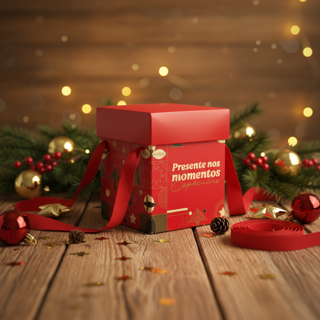 - Design: Layout natalino com frases clássicas, acabamento fosco, e gorgurão vermelho
